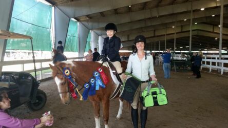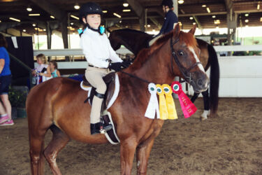 Horse showing is available to riders who are interested and ready. Showing can be done as soon as riders can walk and trot independently while maintaining the correct trot diagonal. Many students begin showing on one of our lesson horses or ponies.