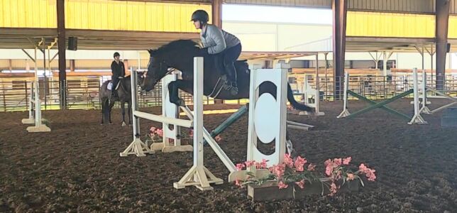 Beau has a huge step and easily makes it down the lines. His jump is beautiful and correct. He is very keen on landing his leads correctly and is 90% consistent in the change when asked. His jump is soft and perfect for the Pony Equitation classes as well! He does not mind what the jumps looks like and doesn’t require a ton of prep.